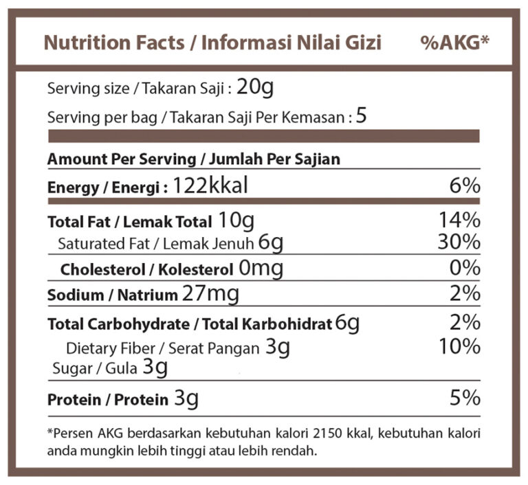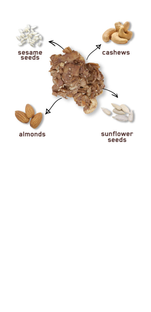 Kelapa kering, biji bunga matahari, kacang almond, kacang mede, gula tebu, gula kelapa, biji wijen, cokelat, tepung beras, minyak kelapa, kakao, garam laut.