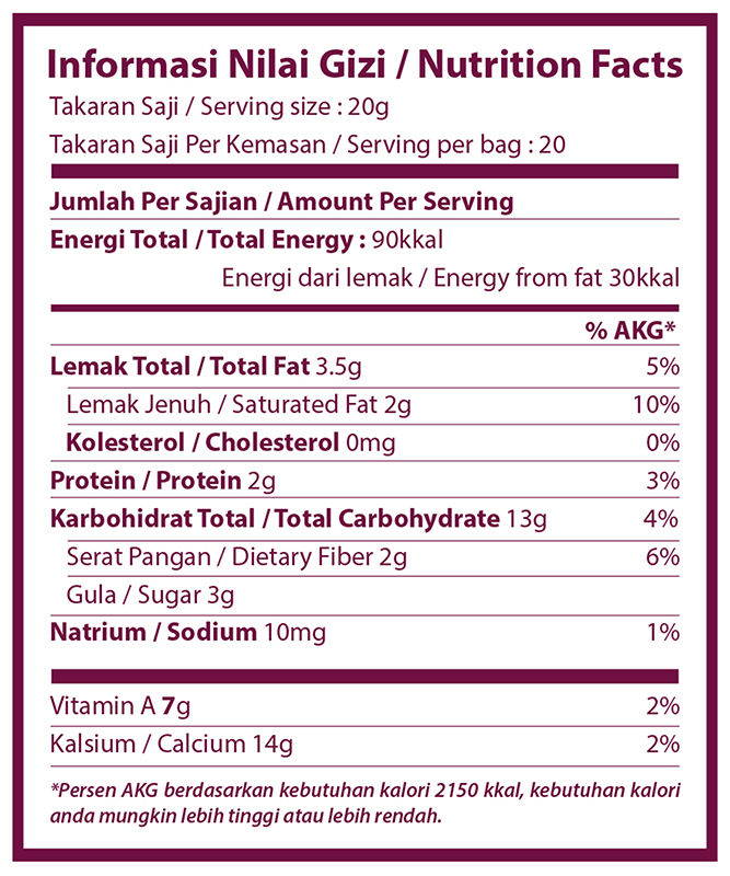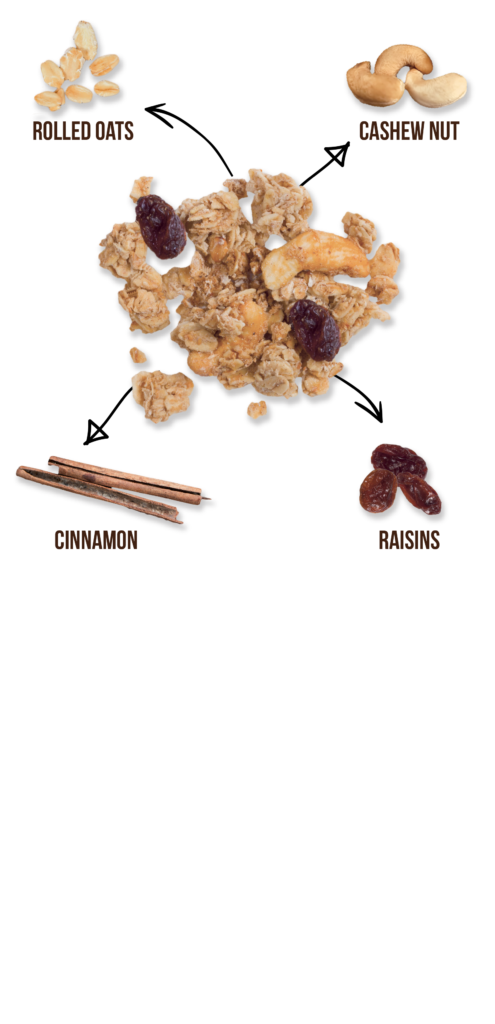 Perpaduan abadi ini menggabungkan kebaikan utuh Rolled Oats, sentuhan tropis Kelapa, dan kerenyahan lembut mete. Kismis kering memberikan ledakan manis alami, yang sempurna disempurnakan oleh sentuhan hangat dari Kayu Manis. Ini adalah resep perdana kami, dan tetap menjadi klasik yang dicintai.