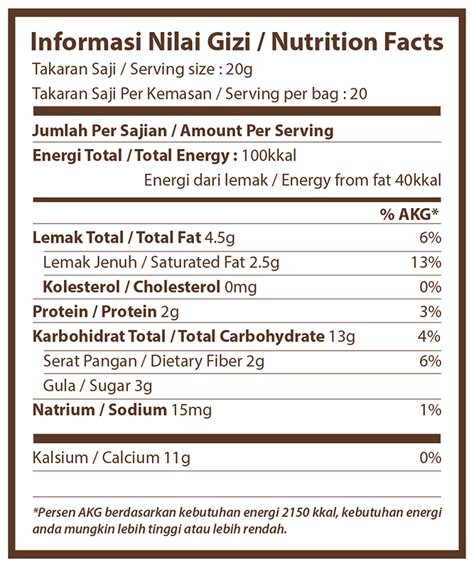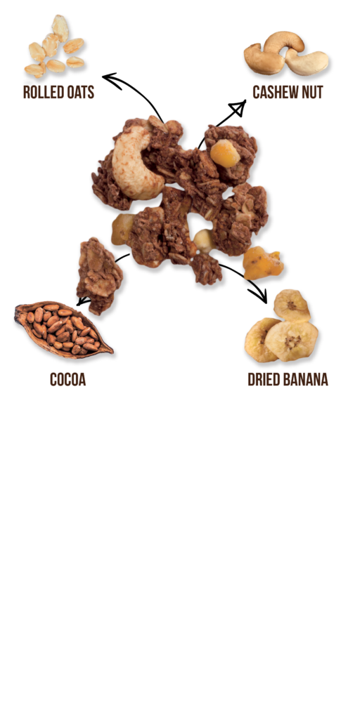 Rolled oats, coconut sugar, sugar cane (contains sulfite), coconut oil, cashew, dried banana (4.4%), dark chocolate compound (3.3%), rice flour, desiccated coconut, cocoa powder (2%), sea salt.
