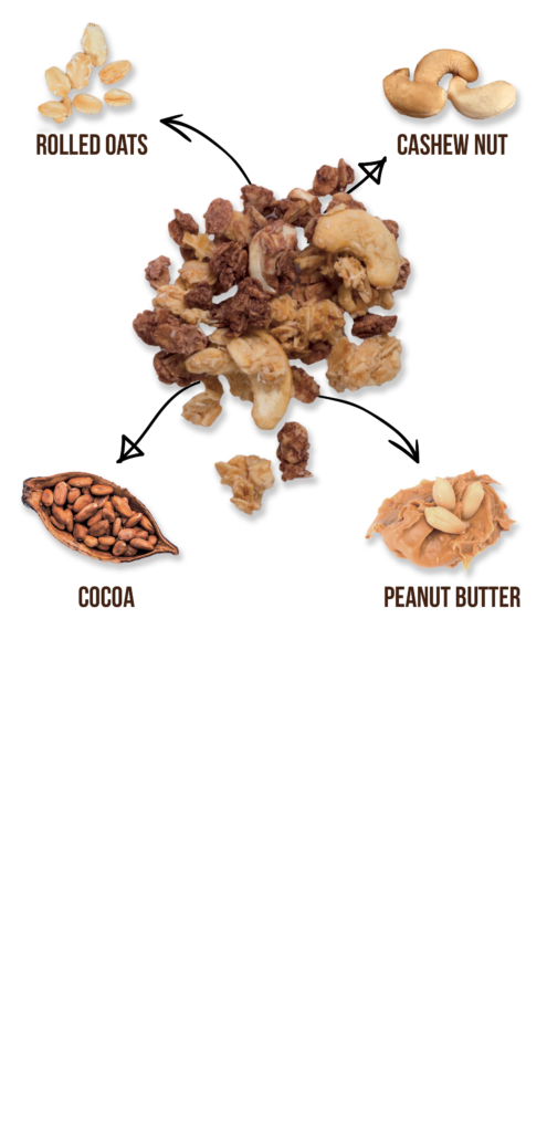 Dive into the indulgent harmony of our “Peanut Butter & Chocolate” granola. Hearty Oats serve as the canvas, enriched by the deep notes of Pure Cocoa. Creamy Cashews elevate the mix, while the velvety richness of Peanut Butter melds everything together in a delightful symphony. A classic pairing, reinvented in granola form.