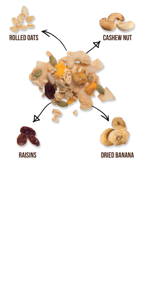 Rolled oats, coconut sugar, raisin (5.2%), sugar cane (contains sulfite), coconut oil, cashew, dried banana (3.7%), dried coconut, pumpkin seeds (2.6%), sunflower seeds, sesame seeds, dried mango (0.7%), sea salt.